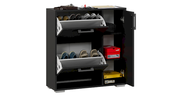 Тумба для обуви имеет 2 откидных ниши для бережного хранения обуви и место за распашным фасадом. Данное пространство можно использовать для хранения обувных аксессуаров и различных мелочей, что без сомнений является преимуществом новинки.