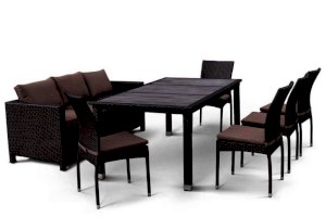 В составе комплекта: стол - столешница декинг, трех местный диван и 5 стульев. Высококачественная лоза из полиротанга коричневого цвета стойкая к любым атмосферным явлениям. Крепкий стальной каркас с полимерным антивандальным покрытием и отличным качеством сварки. Изделие сплетено вручную нашими мастерами под жестким контролем качества на каждом этапе производства. Лоза максимально приближена по рельефу и текстуре к естественному материалу. Идеально подходит для использования на улице и внутри помещения в любую погоду. Не боится воды, солнца и минусовой температуры.