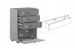 Комод оснащён тремя выкатными ящиками на шариковых направляющих, обеспечивающими плавный и надёжный ход. Ящики подойдут для хранения одежды, белья, аксессуаров или игрушек. В нижней части расположена вместительная откидная секция, предназначенная для более габаритных предметов и сезонных вещей.