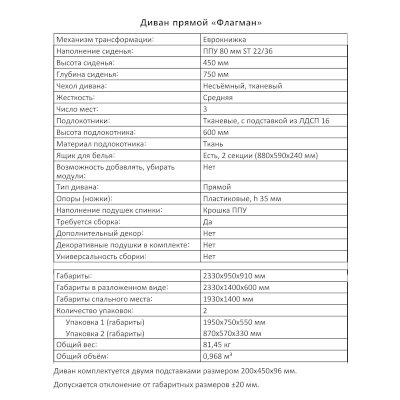 Габариты (ШхГхВ): 2330х950х910 мм