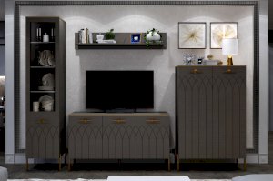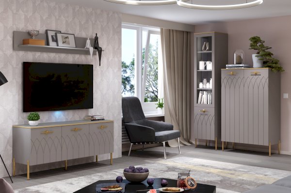 • Применение фасадов МДФ – гарантия долгой службы мебели. Поверхность фасадов soft touch с фрезеровкой – невероятно практичное и красивое решение в современном дизайне мебели. Украшают шкаф металлическая фурнитура и золотая кромка.
